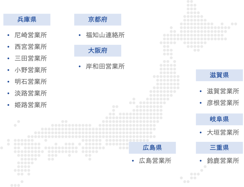 | 営業所 | 尼崎、岸和田、西宮、三田、淡路、明石、小野、姫路、福知山、滋賀、彦根、大垣、鈴鹿、広島 |