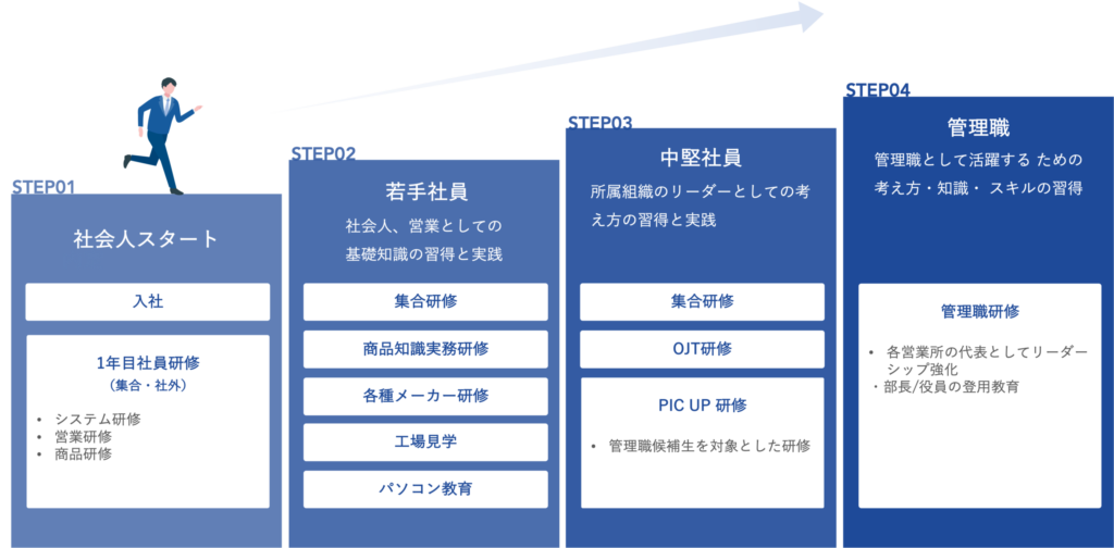 1年目のみではなく、4年目までは年次研修を行います。商品知識研修や、営業のロールプレイング研修などその時に必要なカリキュラムを用意しています。※年1~3回程度